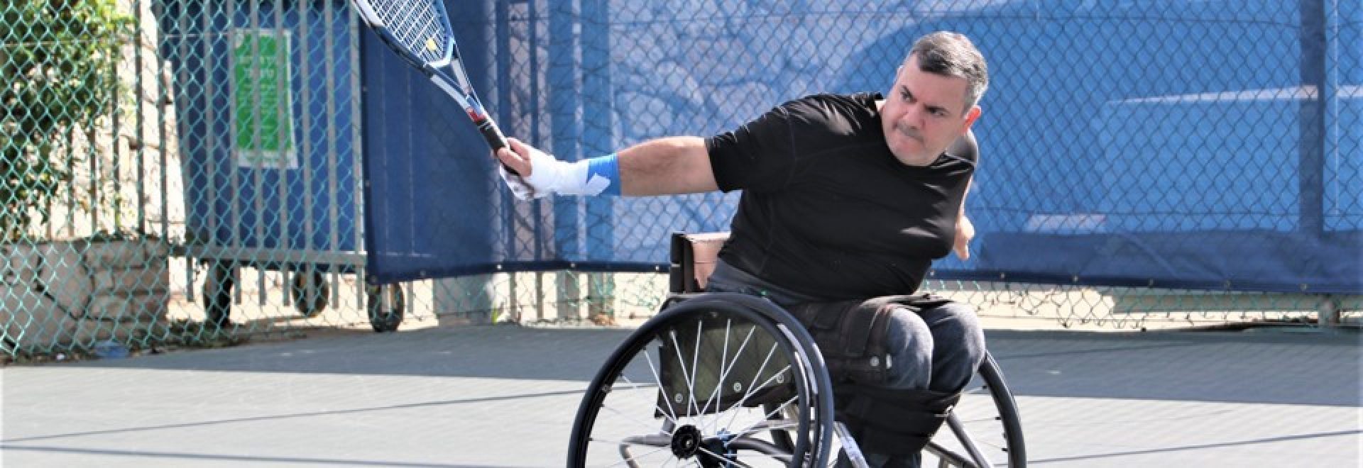 ספורטאי על כיסא גלגלים אוחז מחבט טניס